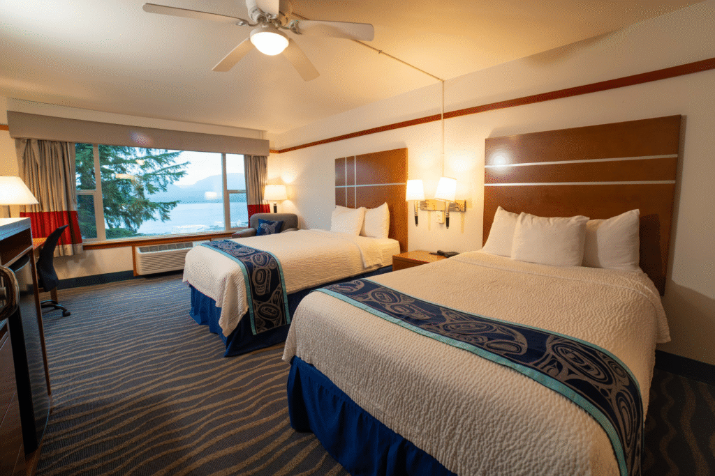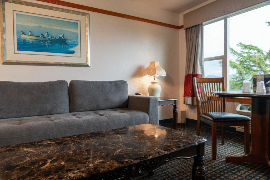 Blue Heron & Thunderbird – Our most spacious accommodations feature a private bedroom with a king bed, a generous living area with a sleeper sofa, and a spa-style bathroom with a soaking tub—all overlooking the Tongass Narrows.